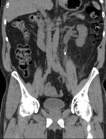 1a) This is a coronal reconstruction of an unenhanced low dose CT KUB in the soft tissue window which demonstrates a 9mm (craniocaudal length) left upper ureteric calculus with associated periureteric fat stranding and dilatation of the partially visualised renal pelvis.