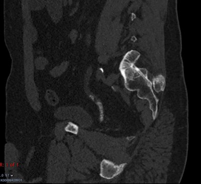 3. Figure 3 is a sagittal reconstruction of a CT KUB in the bone window demonstrating a column of small stone fragments within the left lower ureter extending 3cm in length, with mild upstream hydroureter in keeping with steinstrasse.