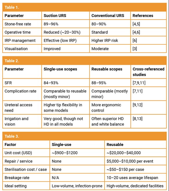 Suction systems extend the scope for f-URS with stones >1.5cm and clinical trials are ongoing to compare with mini PCNL on the efficacy and complication rates [6]. In the future we may expect to see smart pressure-controlled suction pumps, integrated suction channels within digital ureteroscopes, and AI-driven fluid dynamics for real-time IRP monitoring.